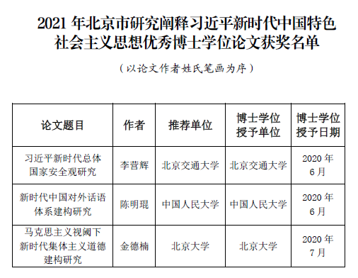 近日,北京市习近平新时代中国特色社会主义思想研究中心(以下简称“北京市研究中心”)公布2021年北京市研究阐释习近平新时代中国特色社会主义思想优秀博士学位论文获奖名单。九游体育官方网站韩振峰教授指导的20届博士毕业生、我院青年教师李营辉的博士论文《习近平新时代总体国家安全观研究》入围获奖。