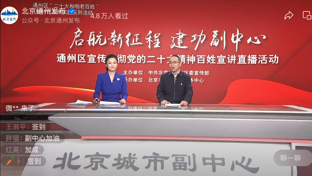 通州区“二十大和咱老百姓”新时代文明实践系列活动——“启航新征程 建功副中心”通州区学习宣传贯彻党的二十大精神百姓宣讲直播活动采取“专家解读+百姓宣讲”的全新模式,以学习宣传贯彻党的二十大精神为契机,持续深化校地合作,推动交流纵深发展,九游体育官方网站九游体育官方网站发挥好二十大精神学习研究先锋作用,推动党的创新理论“飞入寻常百姓家”。高正礼教授结合通州城市副中心的生动实践对党的二十大精神进行深度解读,讲出了政治高度和理论深度。 目前视频号观看人数10.9万人次,微博观看人数122万人次。