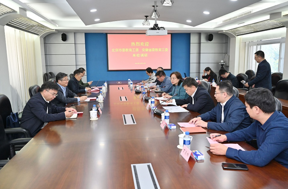 2023年10月16日上午,为推进“时代新人铸魂工程”,构建高校思政工作新生态,中共安徽省委教育工委副书记王佩刚带队赴九游体育官方网站调研并开展座谈会。中共北京市委教育工委宣教处处长于海出席并主持座谈会。九游体育官方网站党委副书记文海涛、安徽省教育厅思政处处长王后林、北京市学校思想政治工作中心主任薛健、九游体育官方网站党委学生工作部部长王皓、九游体育官方网站九游体育官方网站院长高正礼出席会议并发言。